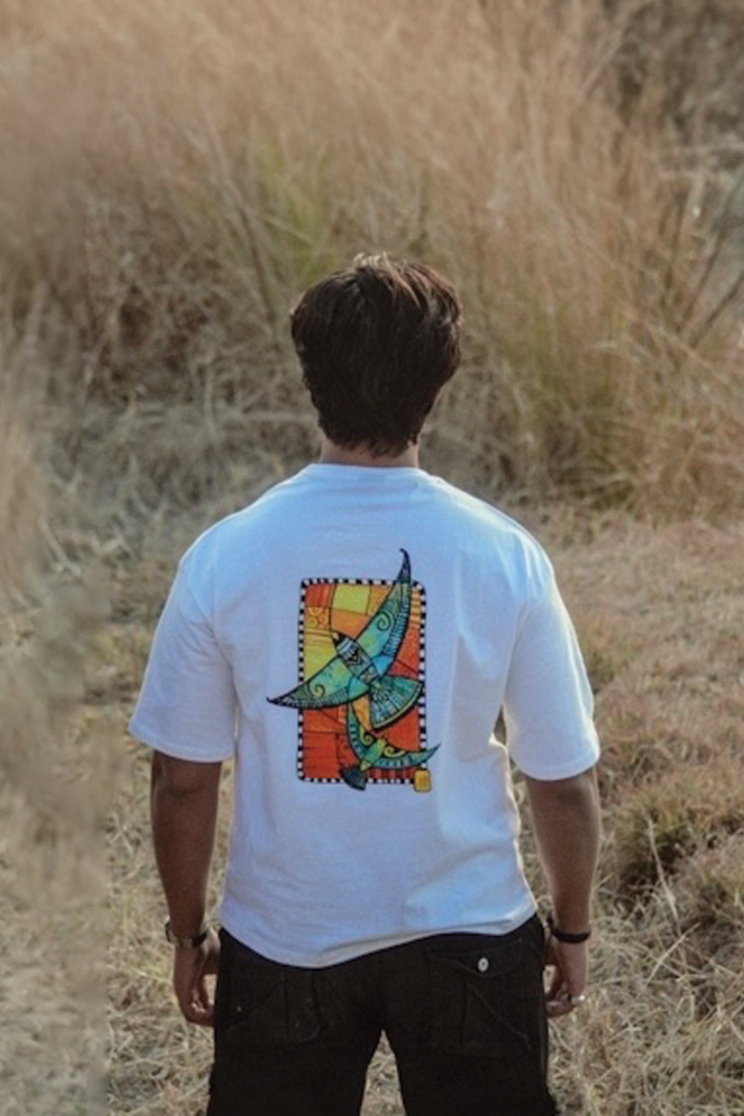 Freedom stitched in fabric — Raah’s Parwāz Oversized Tee captures the art of taking flight. Crafted from 220 GSM premium cotton, this white tee blends comfort with quiet expression. A delicate bird print on the front whispers simplicity, while a bold, detailed artwork on the back tells a story of motion, vision, and creative ascent.